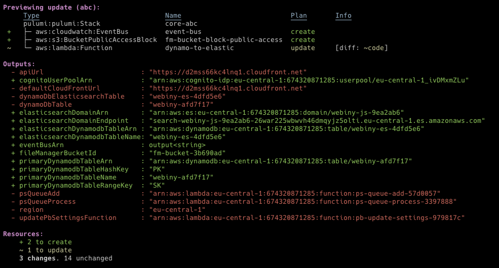 The create operations are related to new Amazon EventBridge that is now deployed with the new Webiny setup, and also the “block-public-access” policy for File Manager’s Amazon S3 bucket (ensures bucket objects are not public).